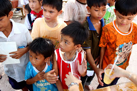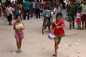 Úi chạy mau lên tụi bay ơi ! Mấy cô chú đang phát đồ kìa !