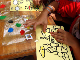 Chạy nhảy nãy giờ mệt quá, chúng ngồi vào bàn và tô tranh cát. Sau khi rắc nhè nhẹ từng hạt cát đủ màu, cả một thế giới xinh đẹp hiện ra rực rỡ : mèo Kitty này, nàng Bạch Tuyết nè , lâu đài, phù thủy, máy bay ... Ôi thôi đủ thứ trên đời. Có bà tiên nào biến mấy bức tranh ấy thành đồ thiệt không há ? Lúc đó nó sẽ có quần áo đẹp nè, xe hơi nè, nhà lầu cao nè, khỏi phải chui vô chui ra cái nhà tranh vách đất trống hươ huất .